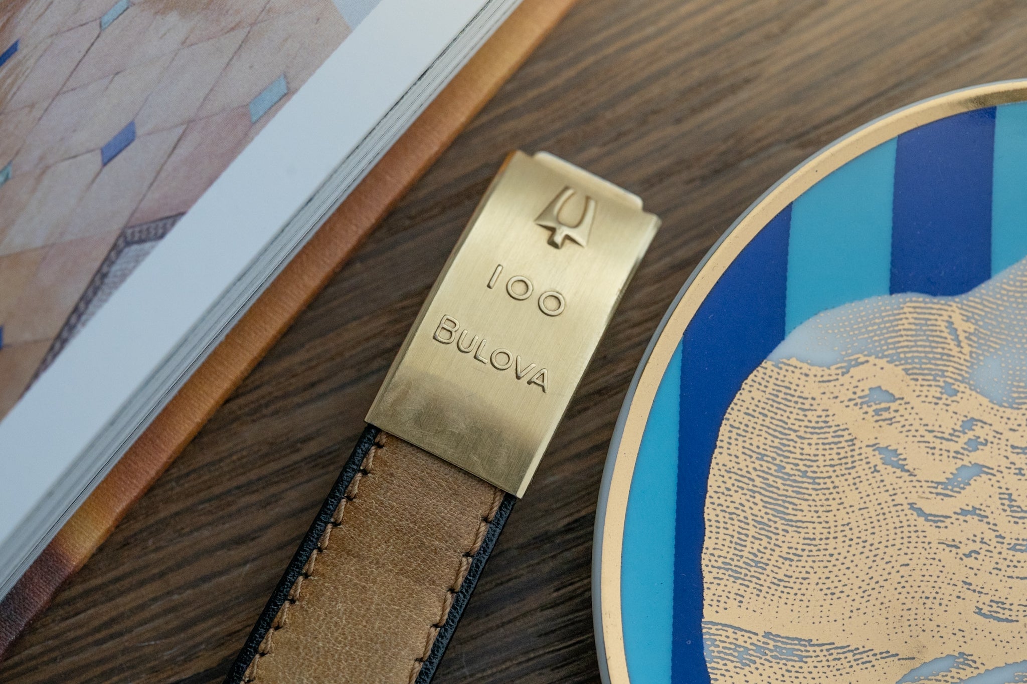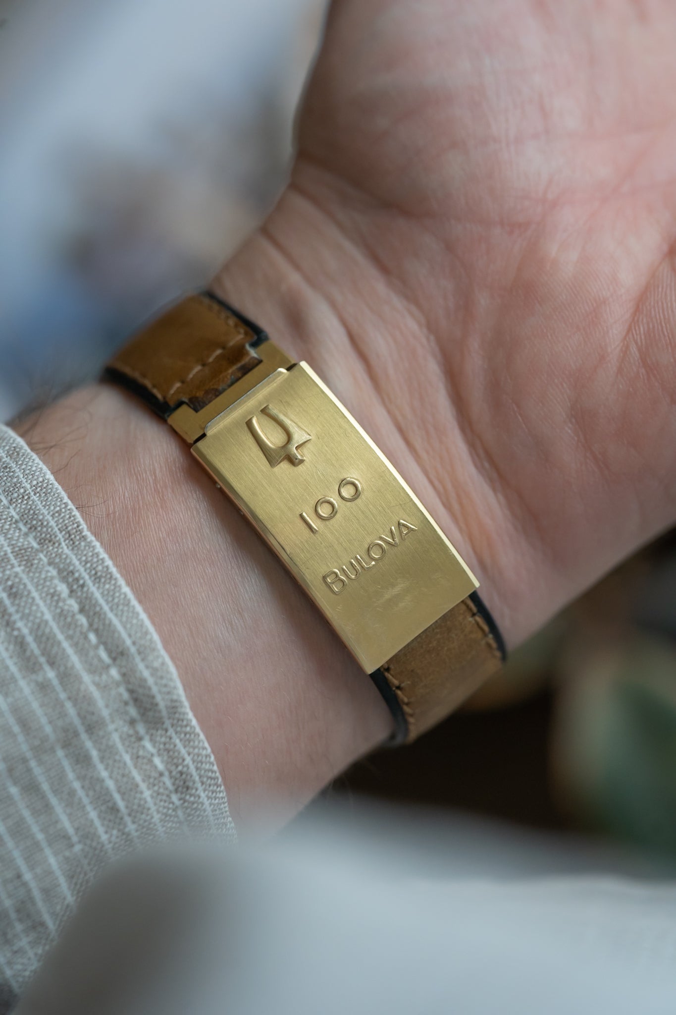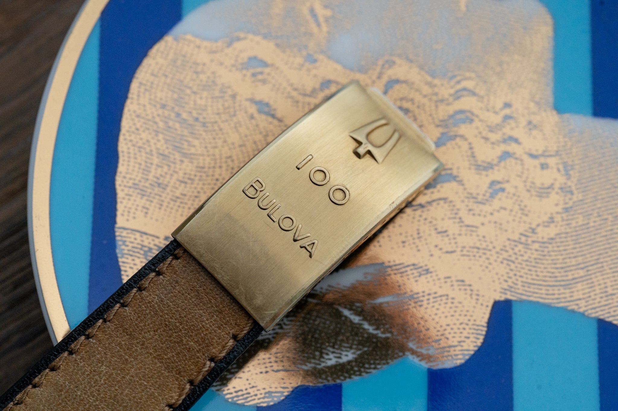 The watch comes on the original Bulova branded leather strap, which shows light wear, and and a special edition gold plated buckle, stamped "Bulova 100", as a nod to this specific anniversary release. The buckle shows some light scuffing on one end but is in overall excellent condition.