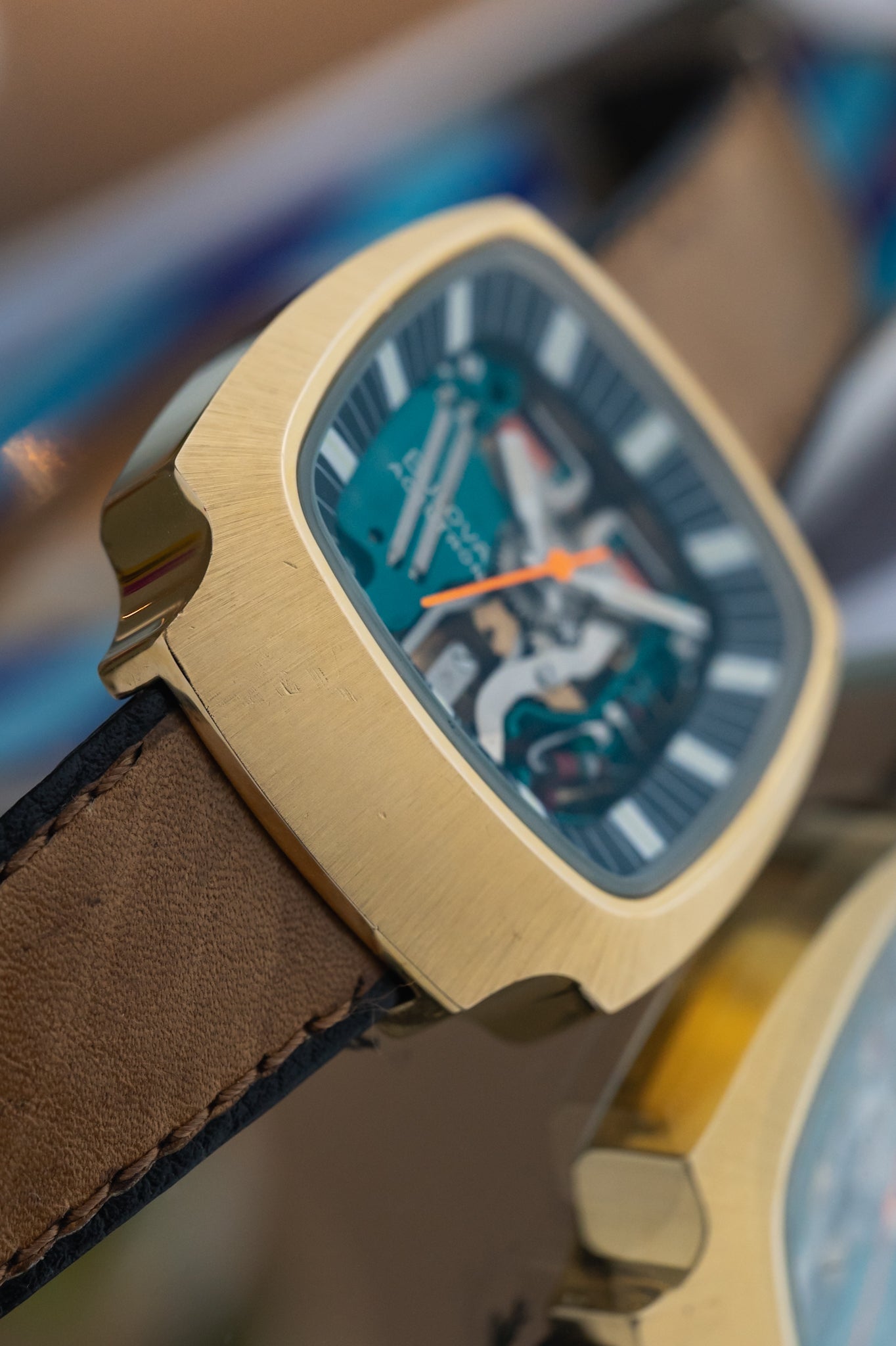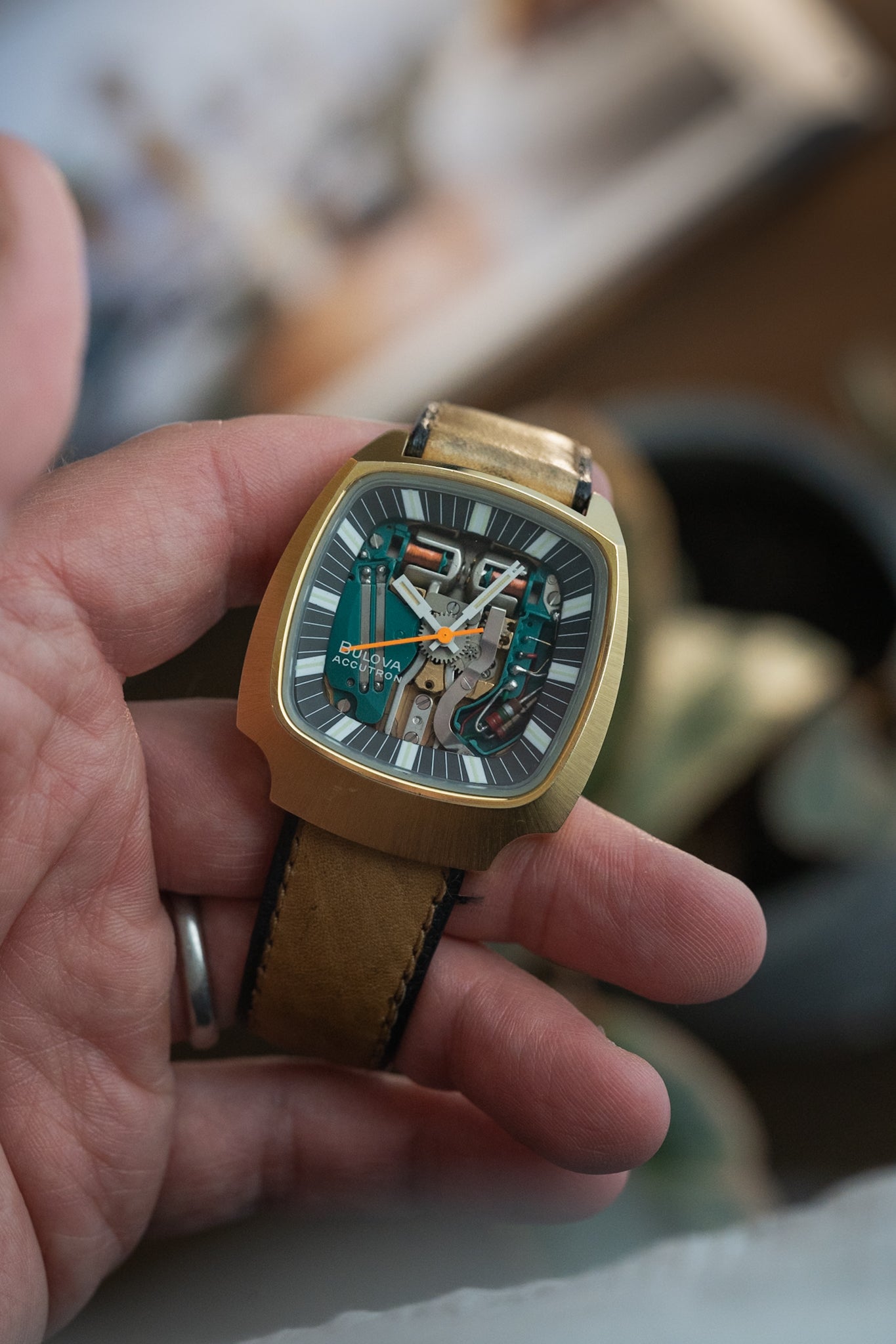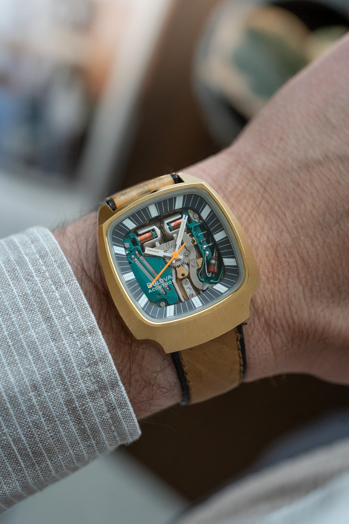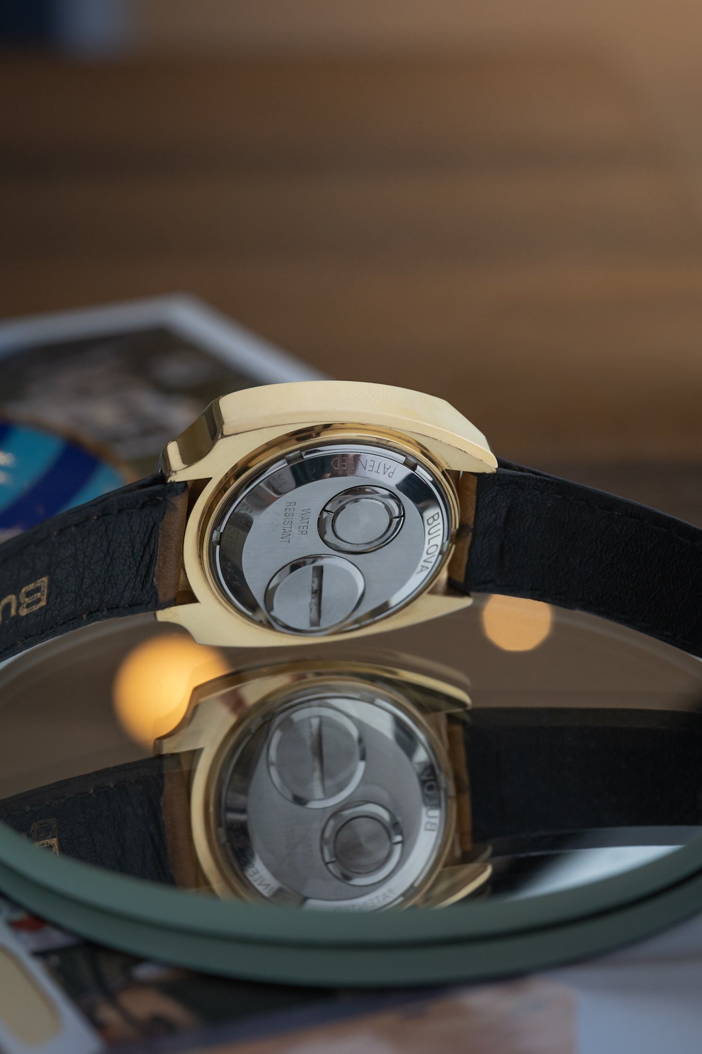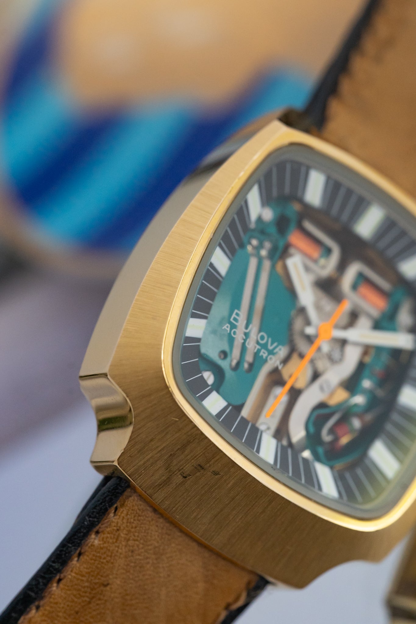 This 1970's release, celebrating Bulova's 100th anniversary, features a bold, and asymmetrical 38mm x 42mm case designed to mimic the shape of a tuning fork, and houses the renowned Calibre 214 movement.