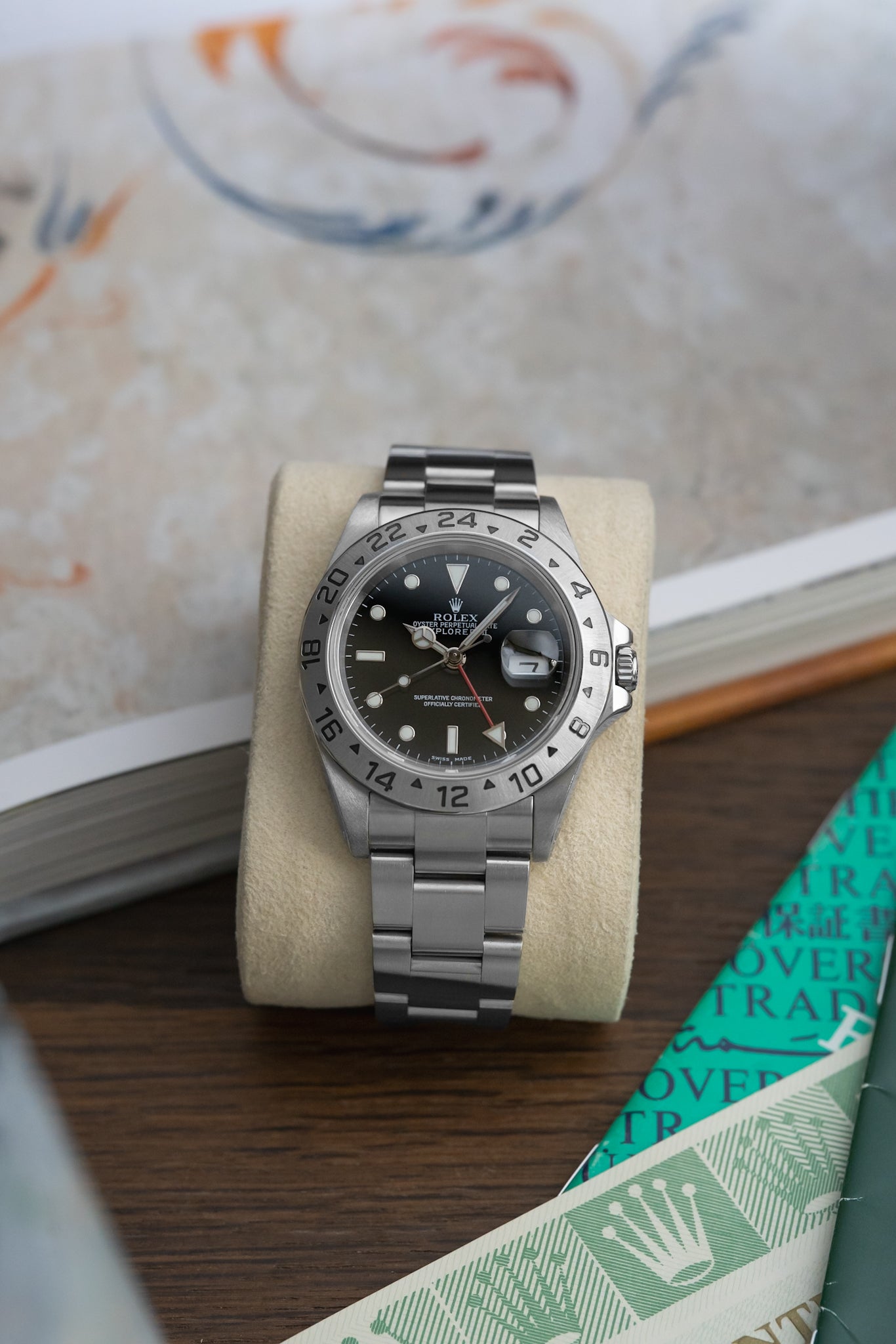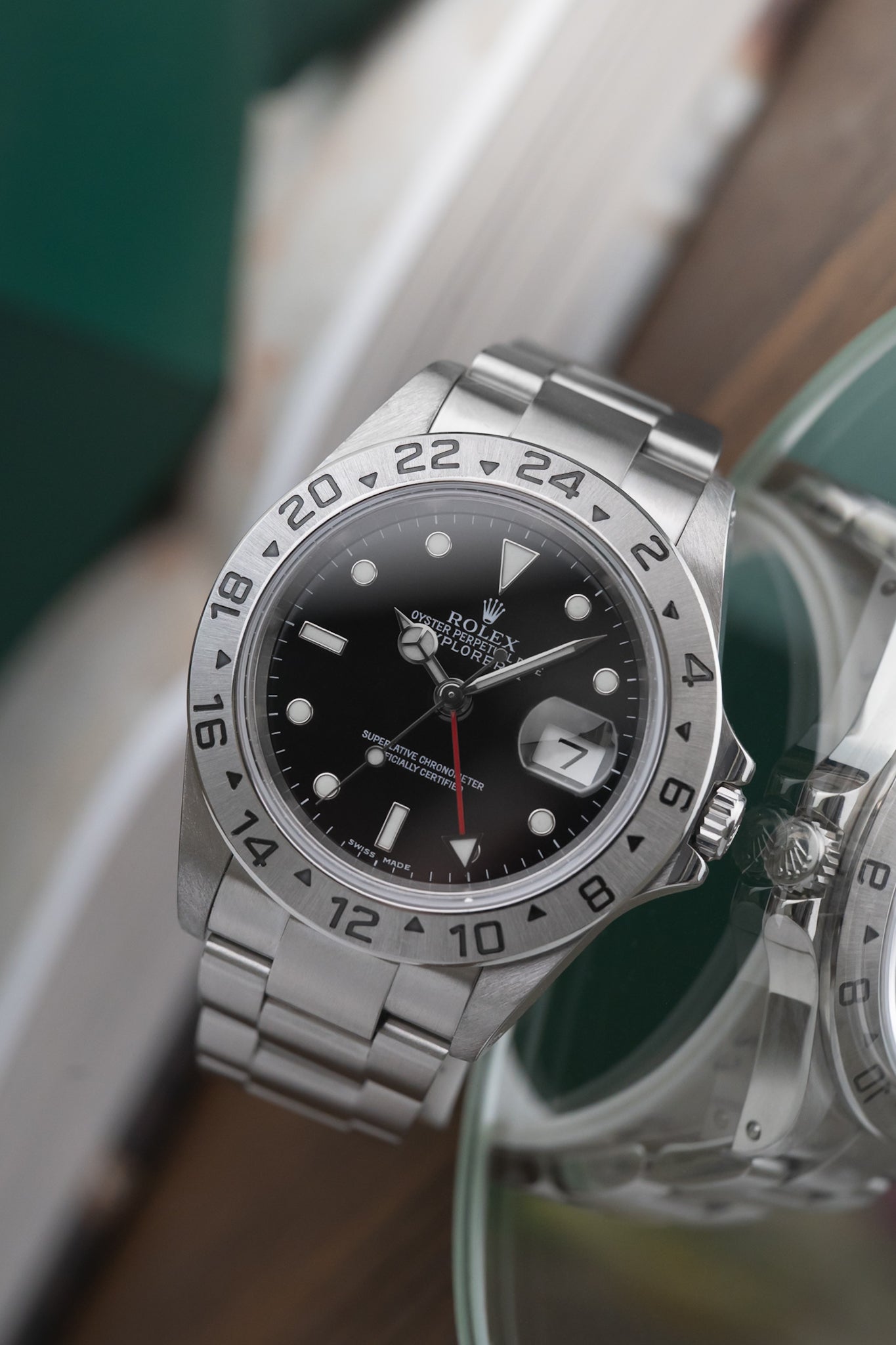The Explorer II 16570 is Rolex’s understated adventurer, built for spelunkers, explorers, and those who needed to track day and night in environments where the sun doesn’t rise or set. The black dial version offers a slightly bolder, stealthier look compared to the polar, while retaining the same rugged functionality that made this reference a tool-watch legend.