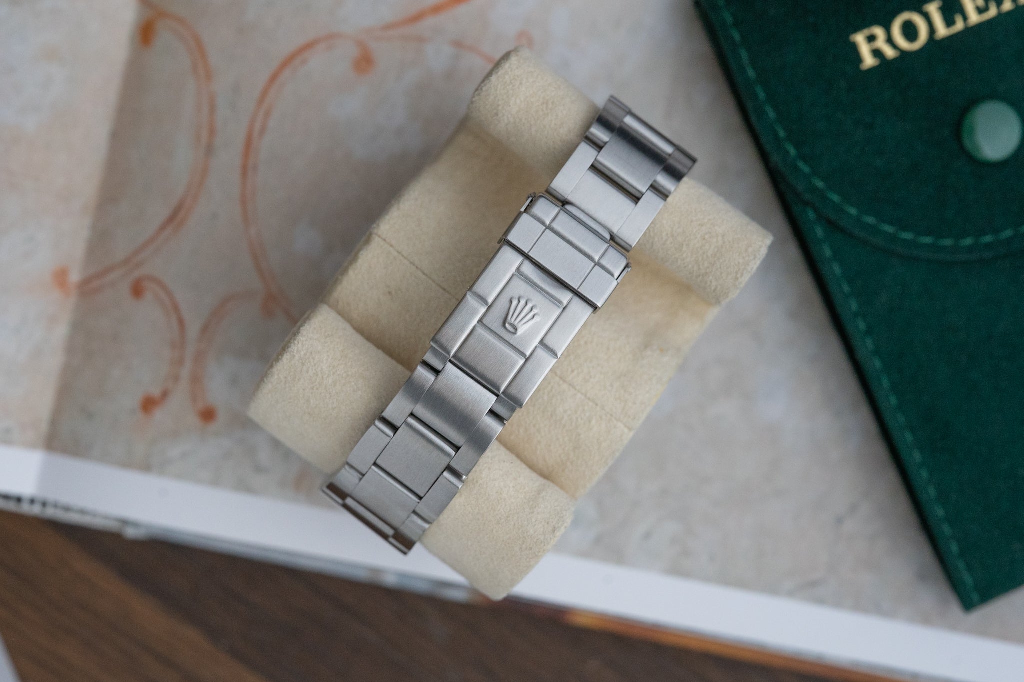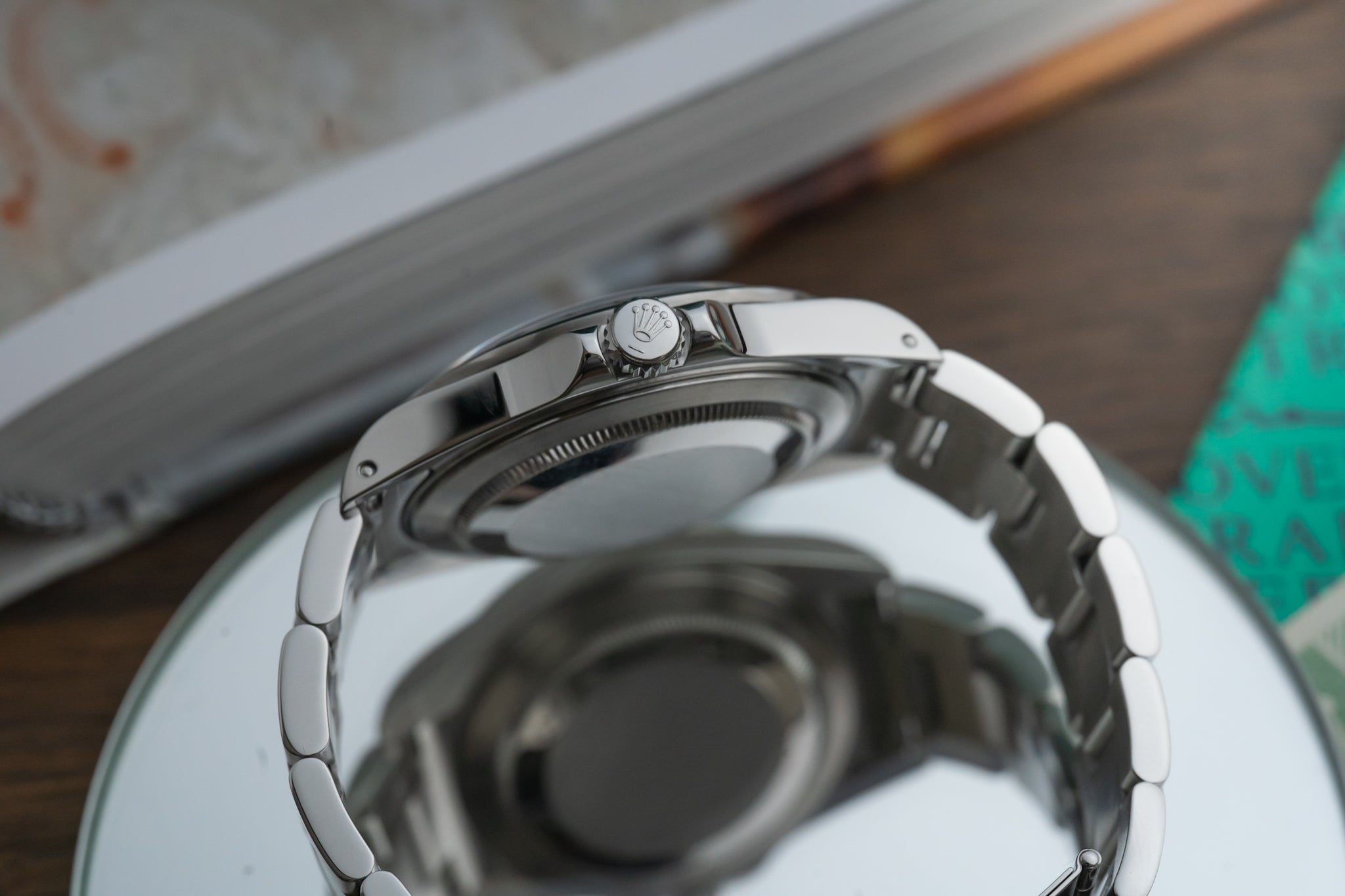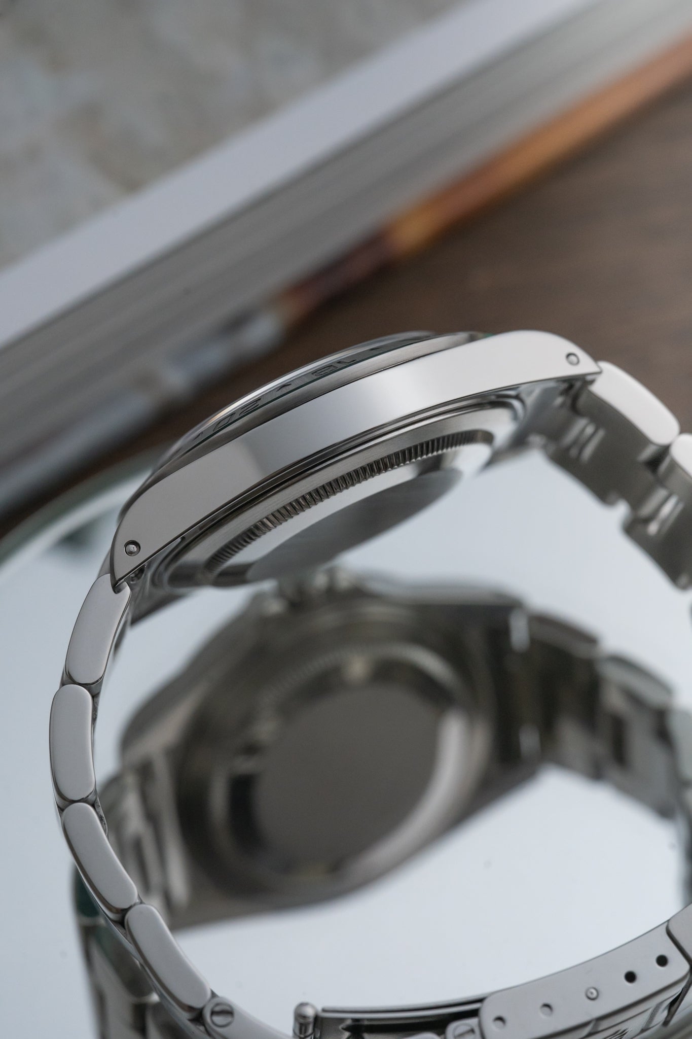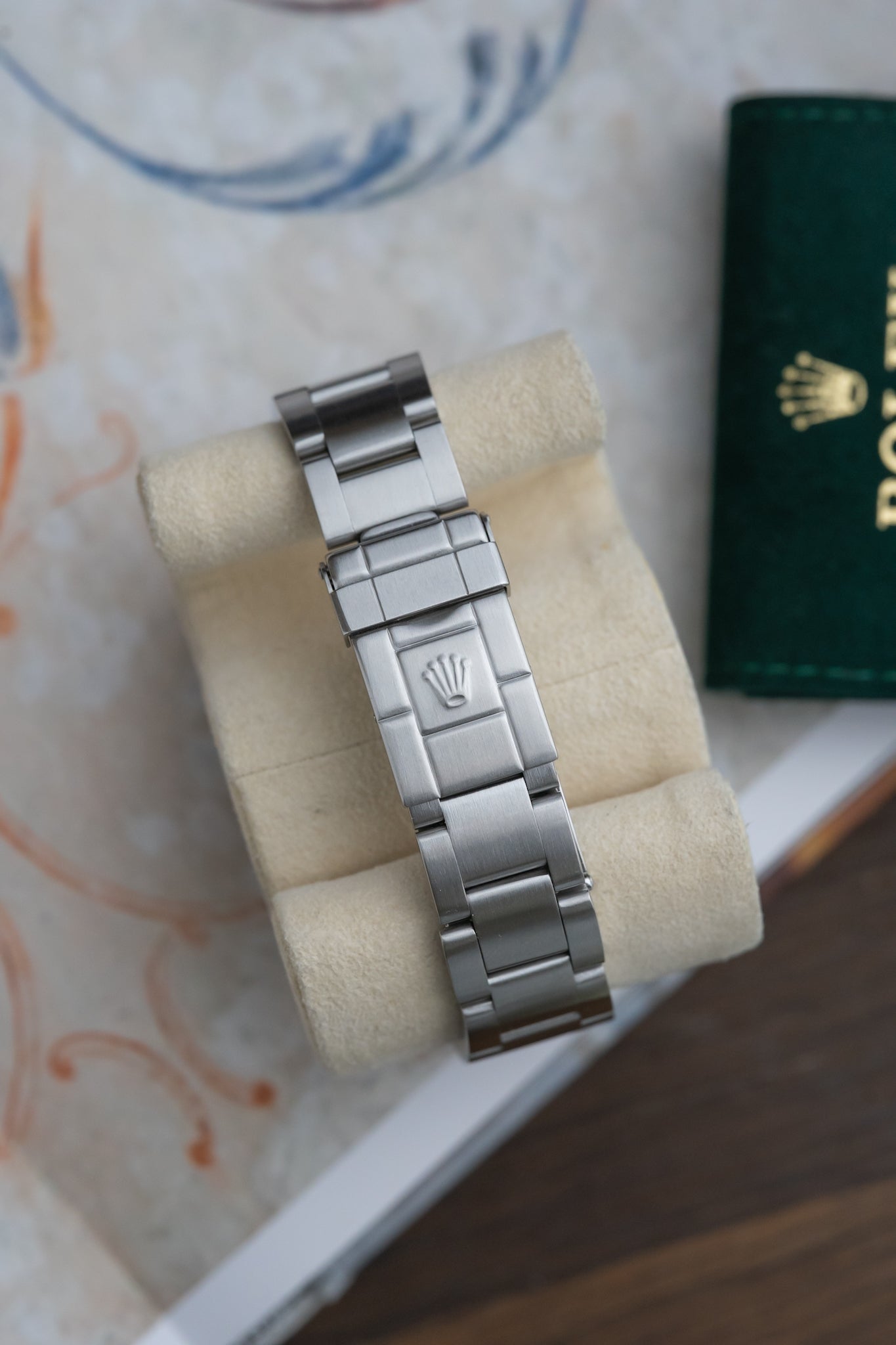 This Y-serial example dates to 2002 and comes complete with its original box and papers, including the stamped and dated warranty certificate. A sharp case, crisp bezel, and robust Oyster bracelet make this a collector-worthy set that still wears with everyday versatility.