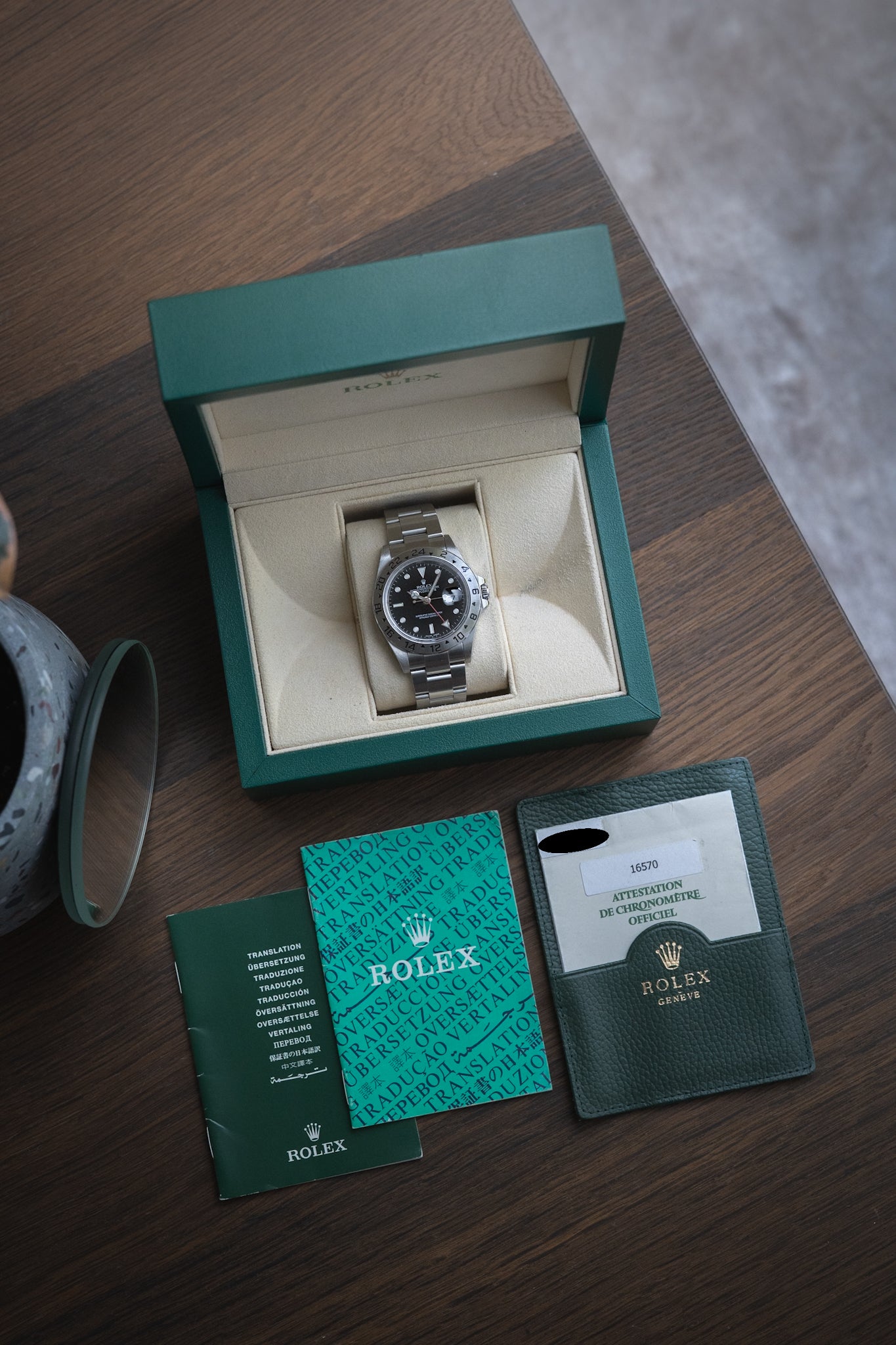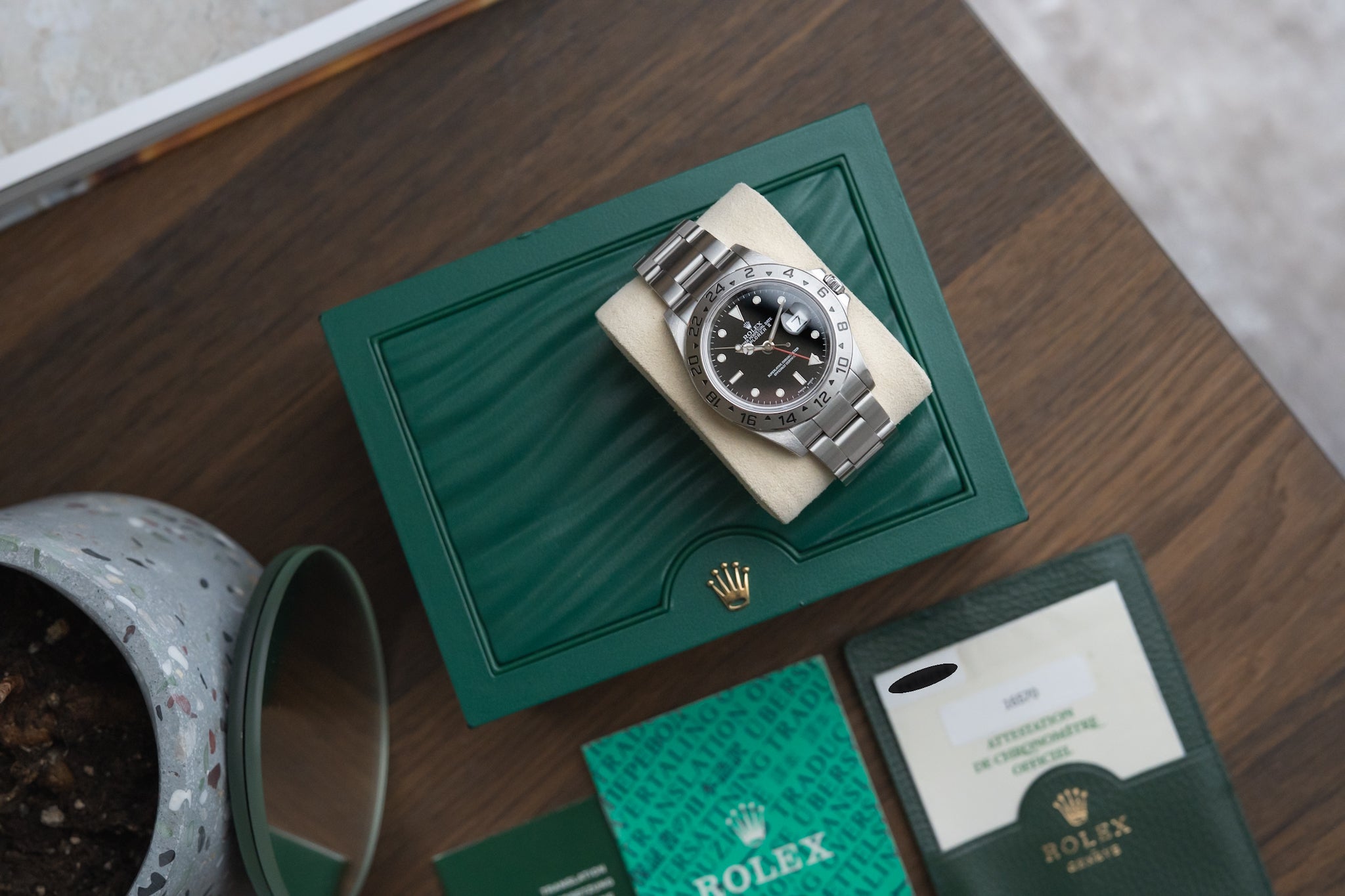 The Explorer II 16570 bridges the gap between vintage charm and modern Rolex engineering. At 40mm, it has classic proportions while housing the robust Caliber 3185 GMT movement. Its black dial variant is often seen as the more versatile and sport-forward choice, pairing seamlessly with anything from a suit to hiking gear. Complete box and papers examples from this era are becoming increasingly sought after, especially in excellent condition like this one.
