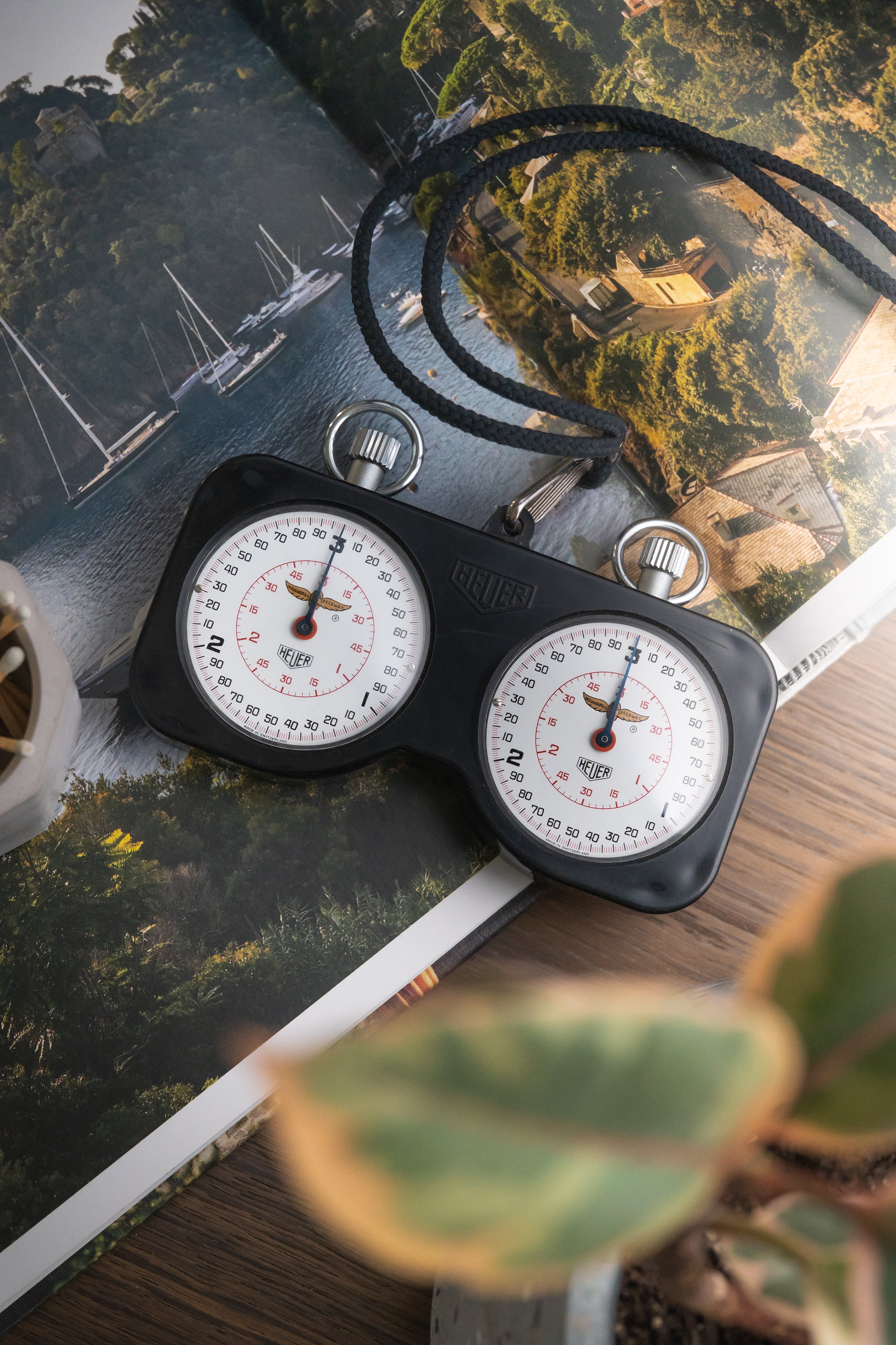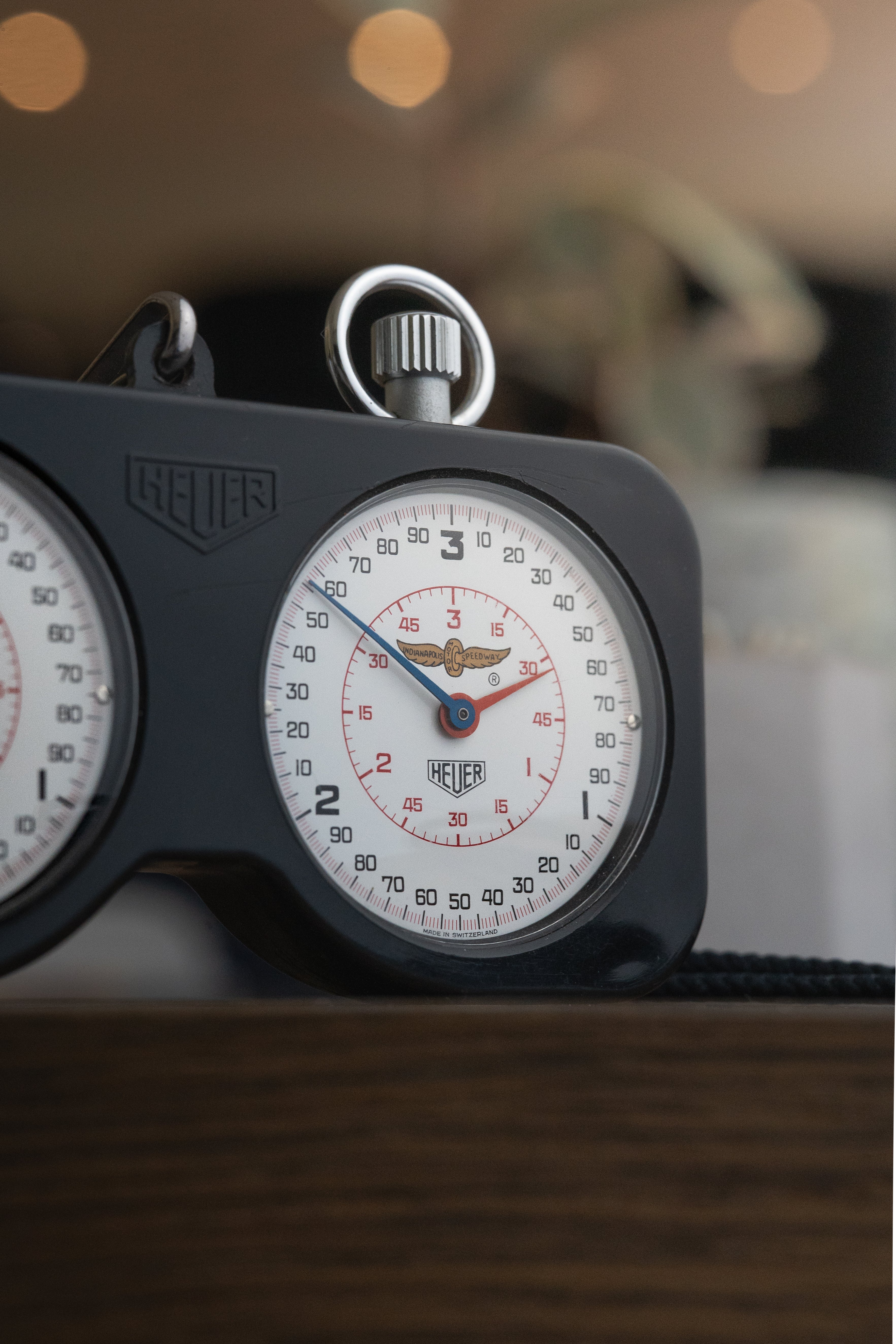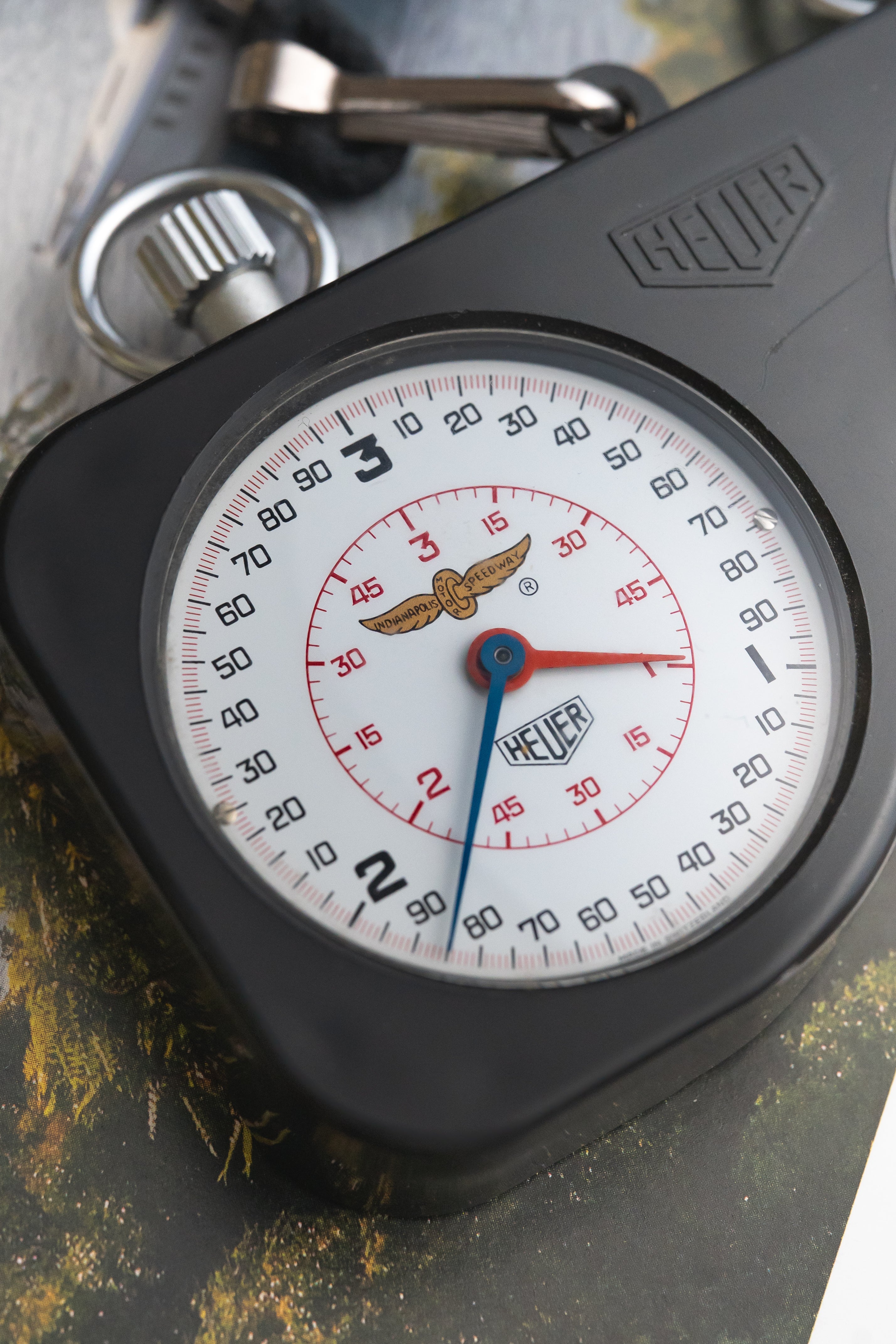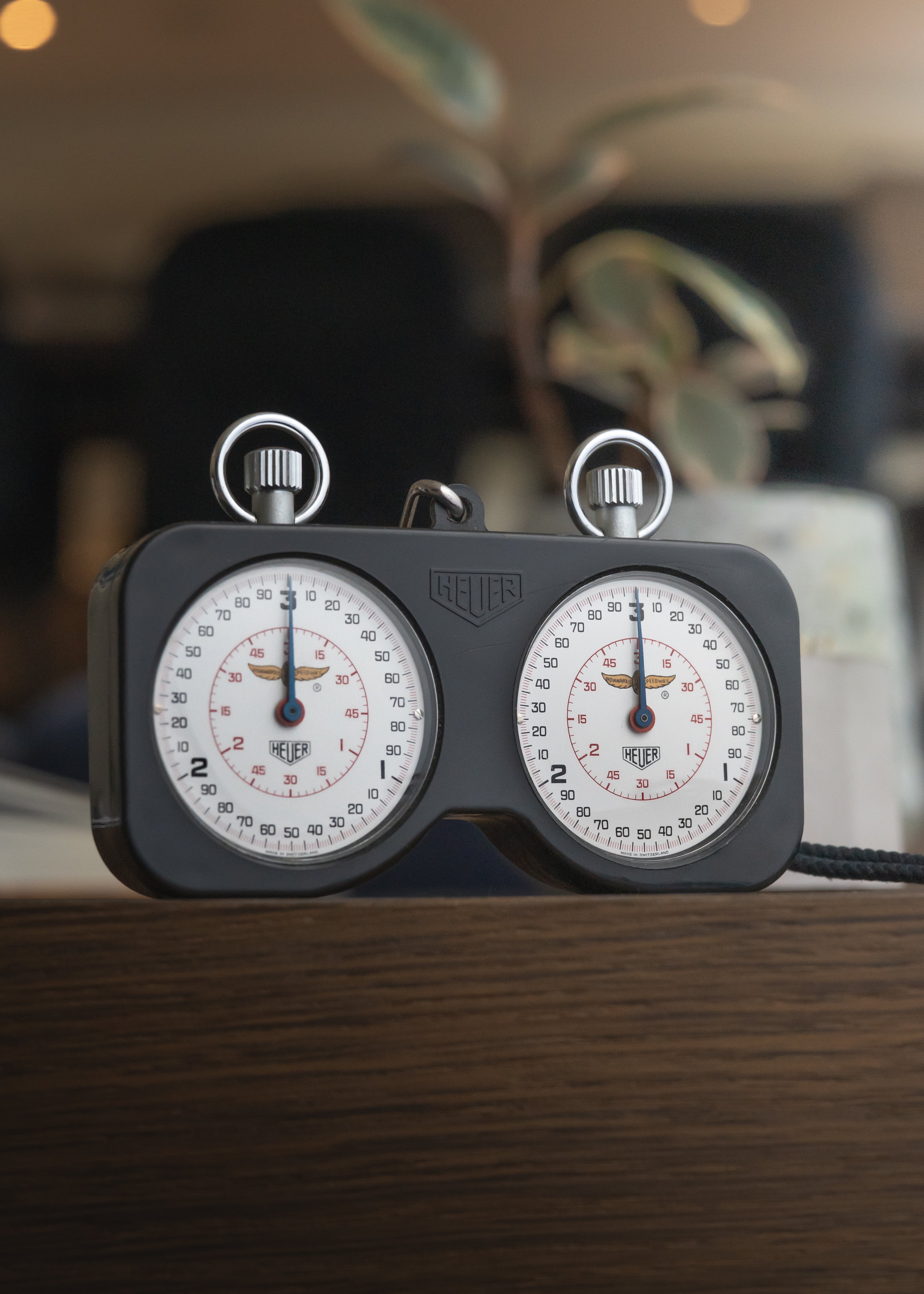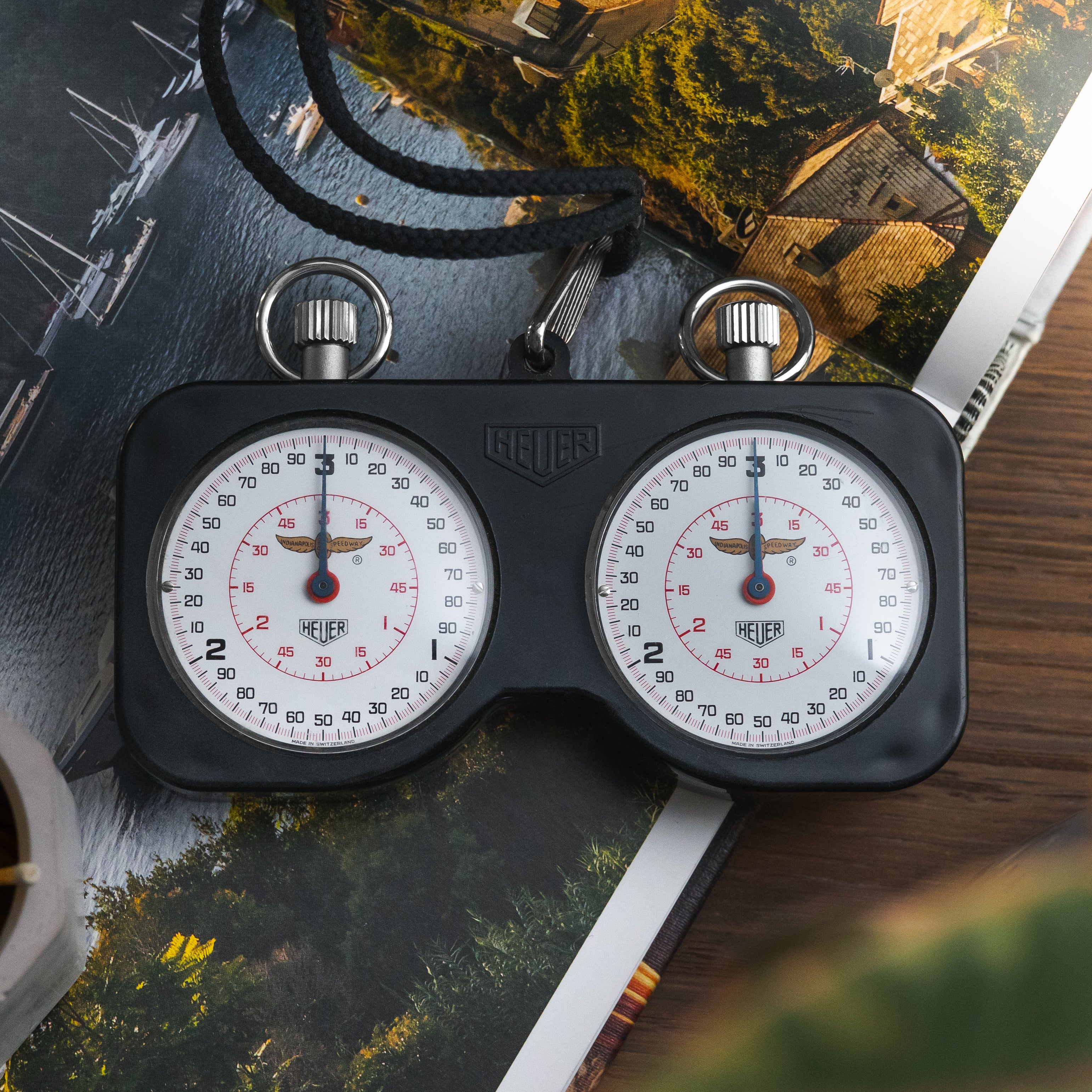 This example, a rare matched pair of IMS-signed Heuer 503.220 stopwatches are housed together in their original black Heuer-branded twin housing. Using the pair together allowed race officials, team members, and spectators to time consecutive laps of a car, or compare performance between two cars on track.