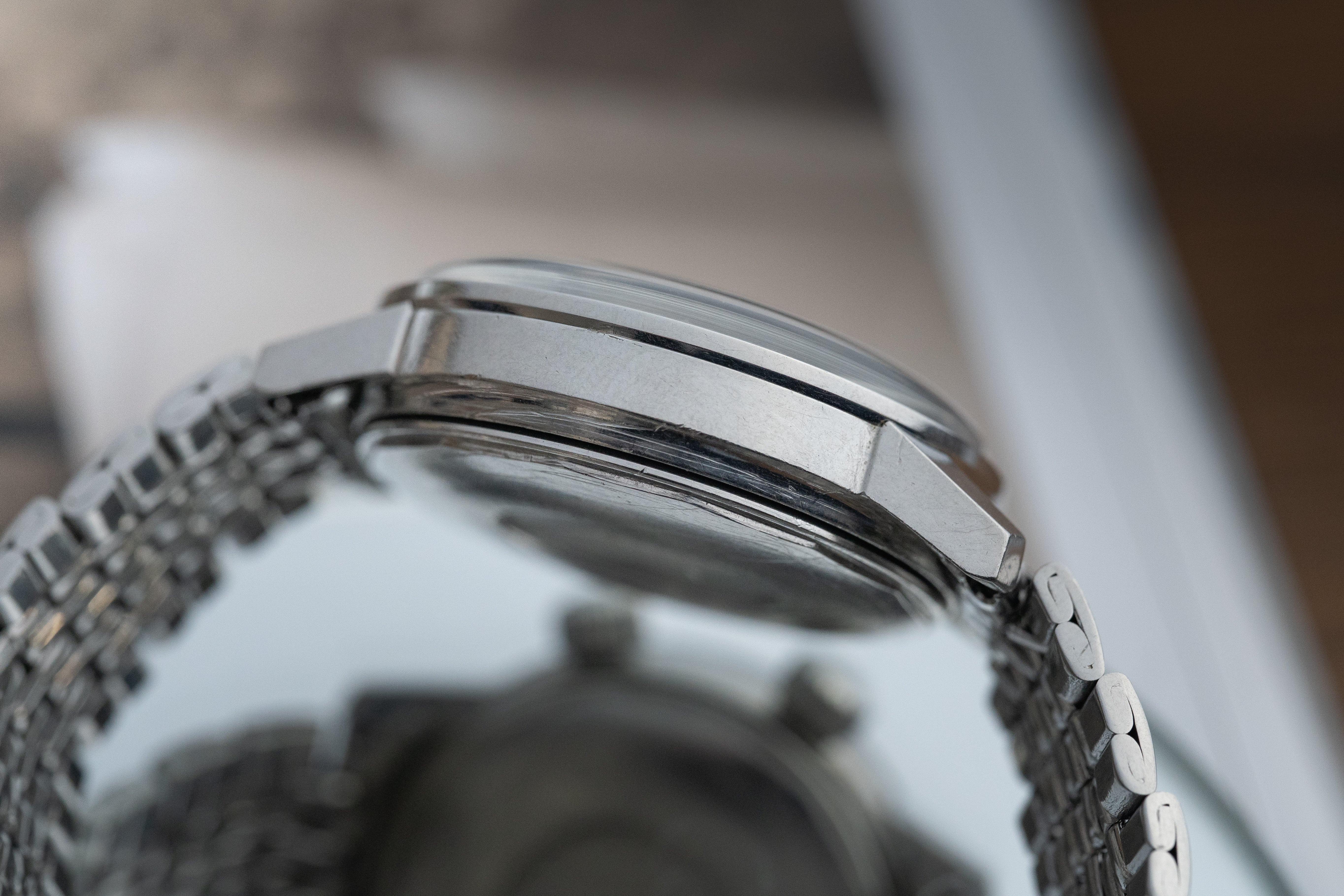 The Ref. 812 is built around the patented EPSA Super-Compressor case, where increasing water pressure enhanced the case’s seal as depth increased. Measuring a restrained 37mm, with sharply defined lugs and a balanced profile, it offered 200 meters of water resistance without sacrificing everyday wearability. Twin screw-down crowns at 2 and 4 o’clock define the design: the lower crown operates the internal rotating dive bezel, safely protected beneath the crystal, while the upper crown manages winding, setting, and the date. This system reduced the risk of accidental bezel movement and gave the watch its clean, functional aesthetic.