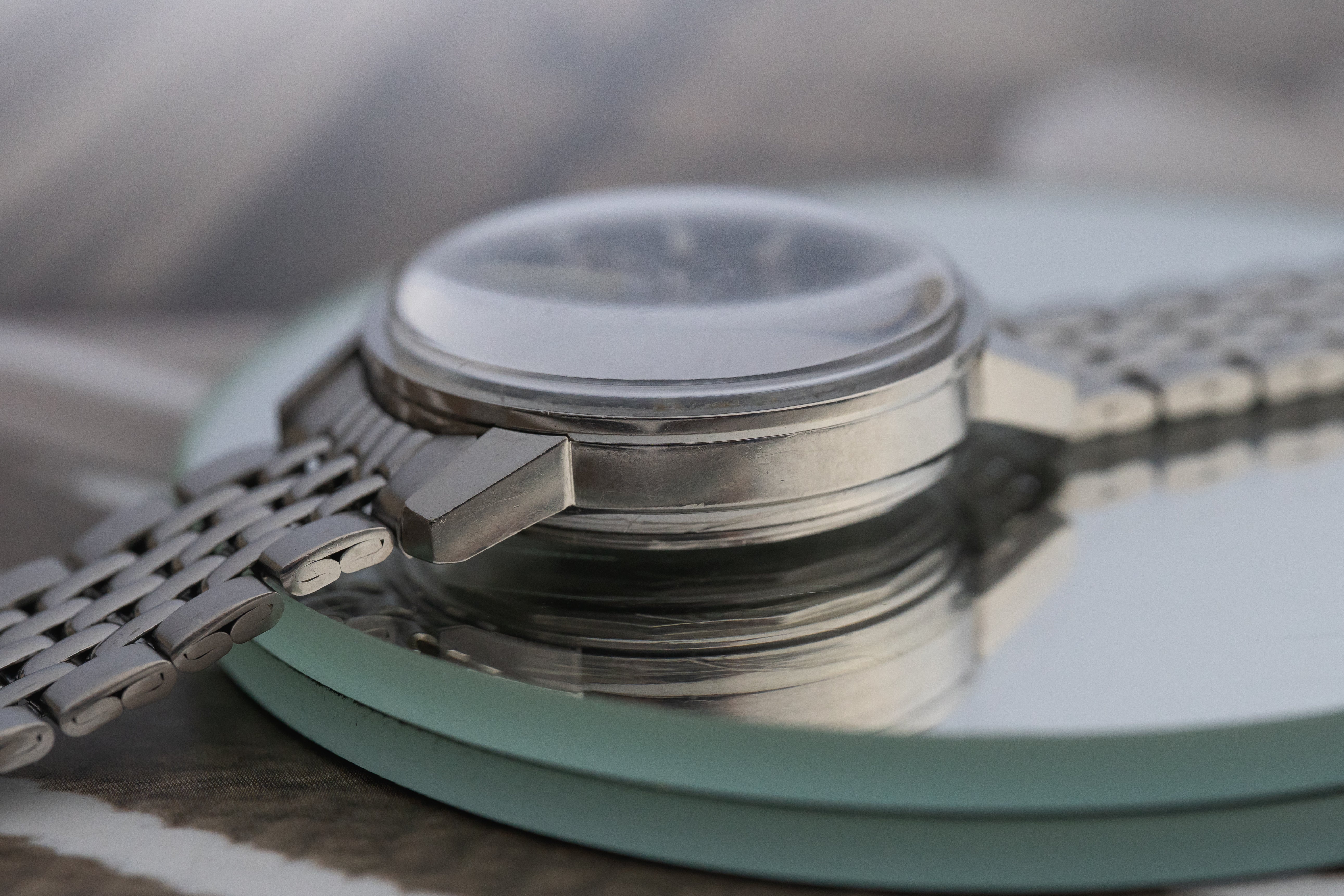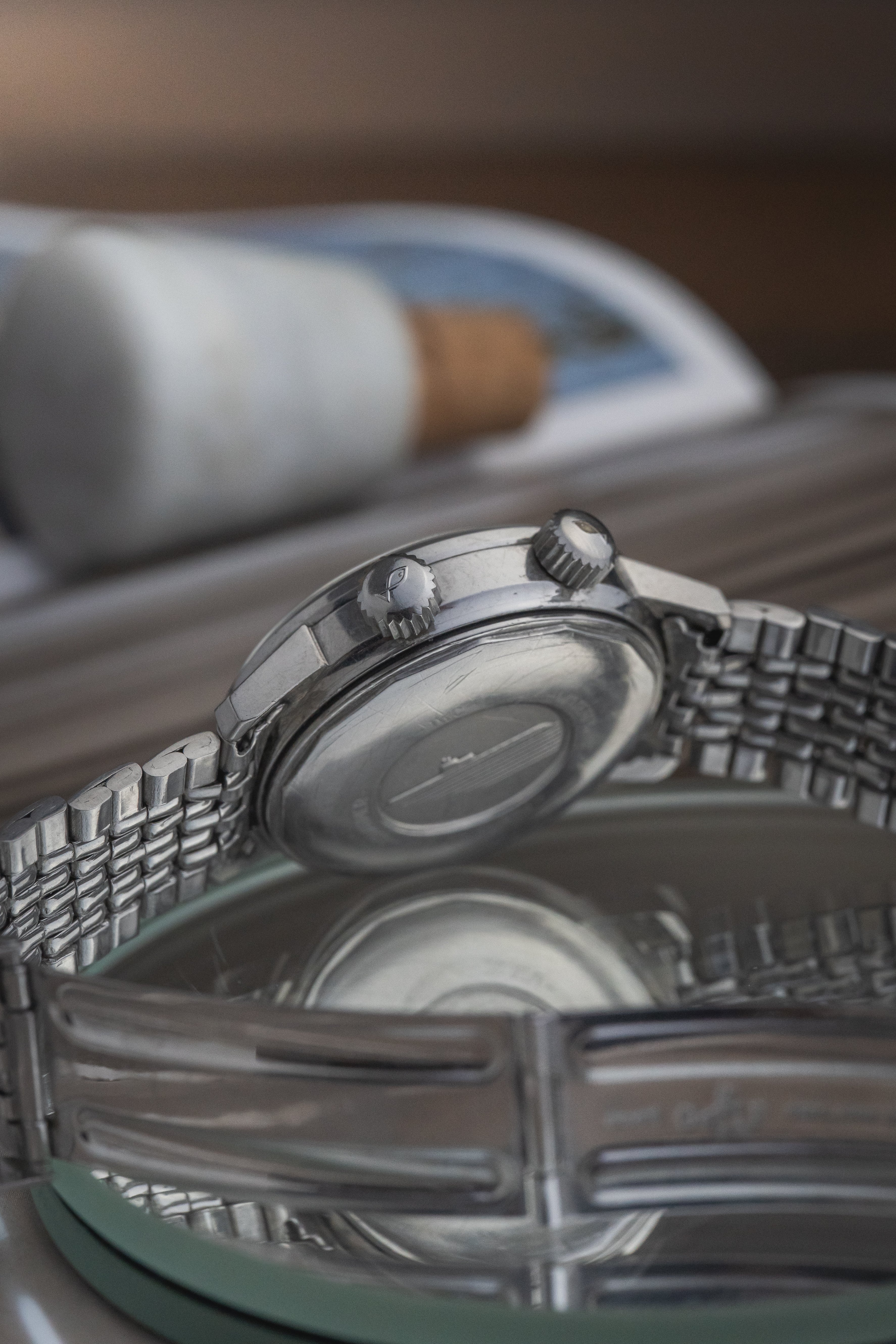 The unpolished stainless-steel Super-Compressor case remains well-defined, retaining its original form with crisp lug lines and honest signs of wear consistent with age. The twin crowns are correct to the model and operate smoothly.