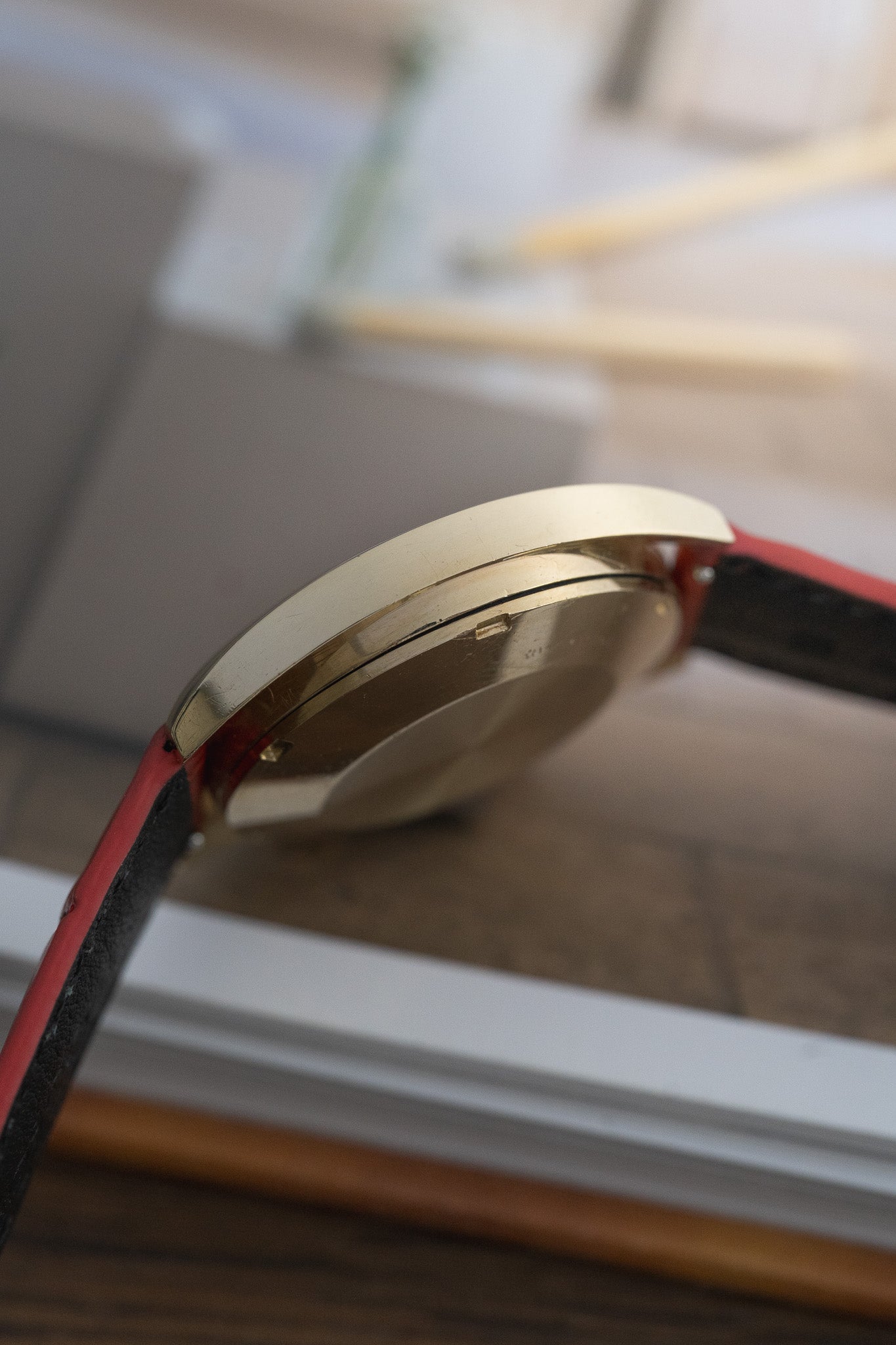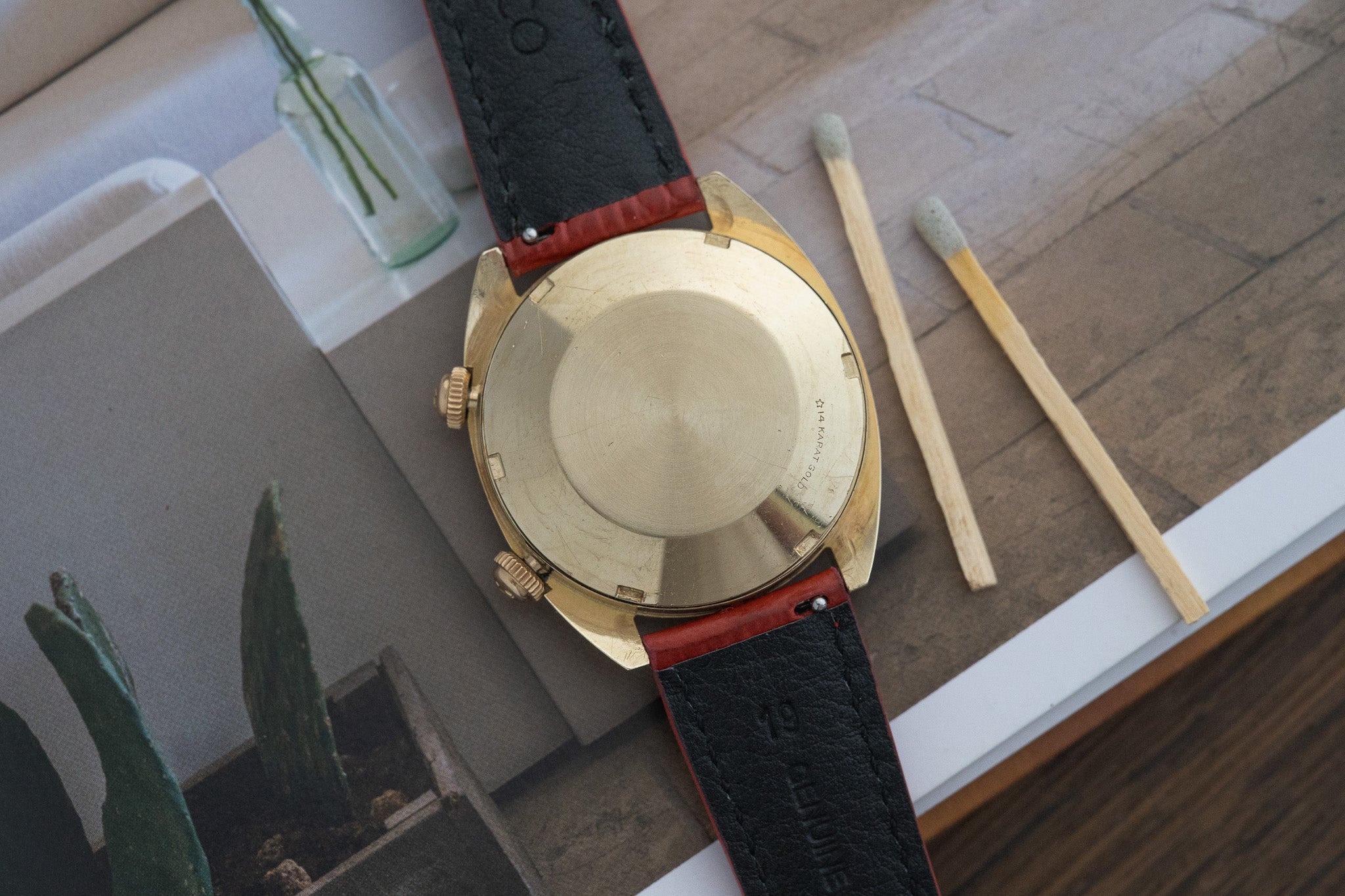 The star of the show is really its original fume sunburst dial, transitioning from warm bronze at the center to a smoky vignette at the edges. Honest in its aging, with only light spotting, the dial radiates vintage charm and depth that make every glance rewarding. Framing it all is an impressive chunk of gold: a unique egg-shaped case with striking contours.