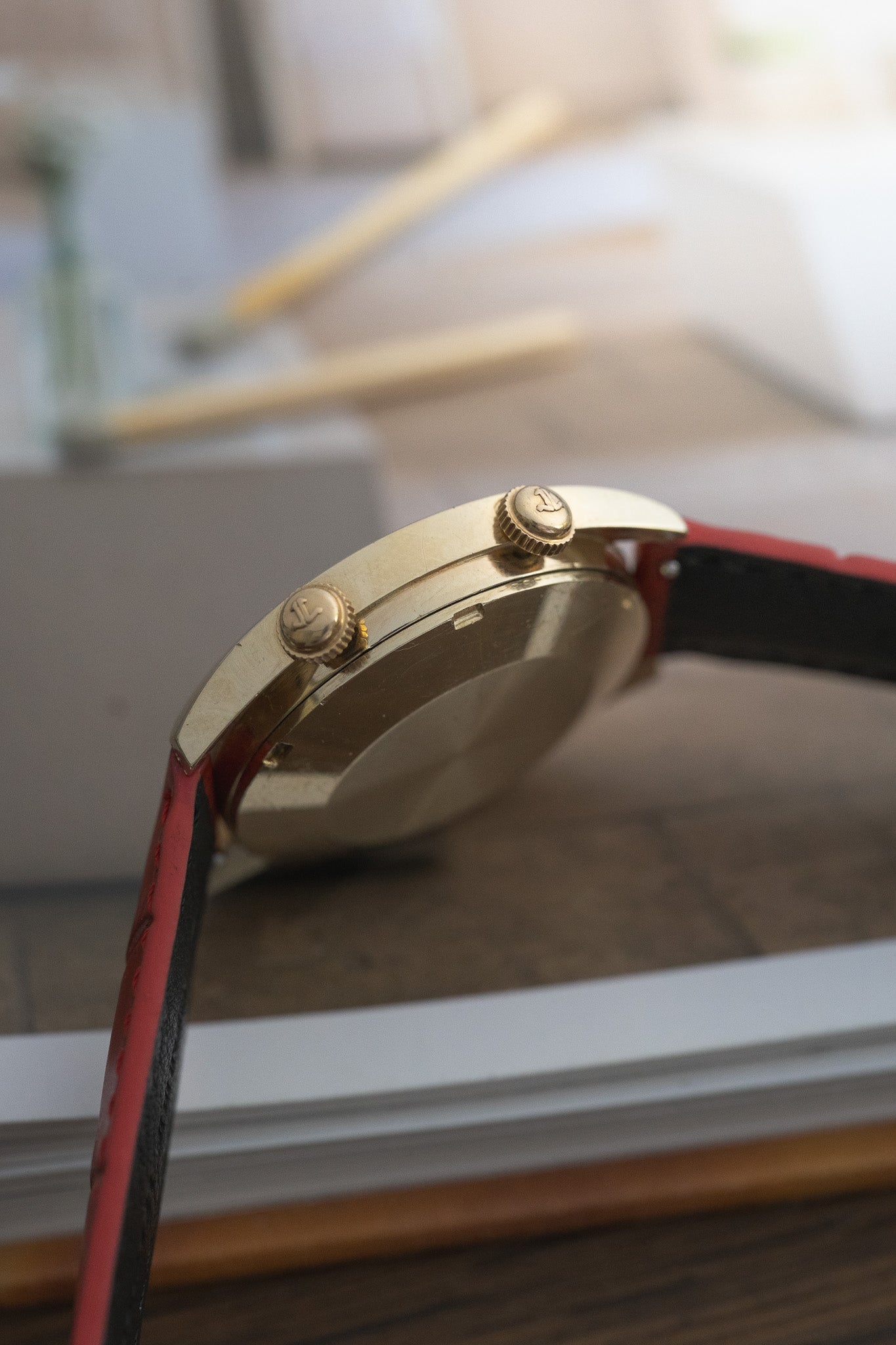 Introducing the LeCoultre Memovox “Speed Beat,” reference 3089-916, a remarkable specimen that perfectly captures late-1960s watch design and Jaeger-LeCoultre’s spirit of technical innovation. This U.S.-market example, cased within a chunky block 14k solid gold (really a lot of gold), boasts the instantly recognizable “egg” case profile: bold, sculptural, and unmistakably of its era. Measuring 37 x 41 mm, the watch wears with commanding presence, and in my opinion, is one of the finest examples of evolving watch design being brought to market at this pivotal time.