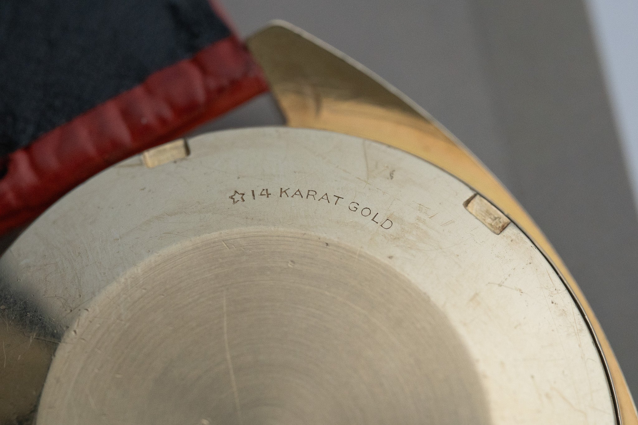 Case: 37 x 41 mm solid 14k yellow gold “egg” case, tastefully polished with strong lines and excellent wrist presence. Light signs of wear only.