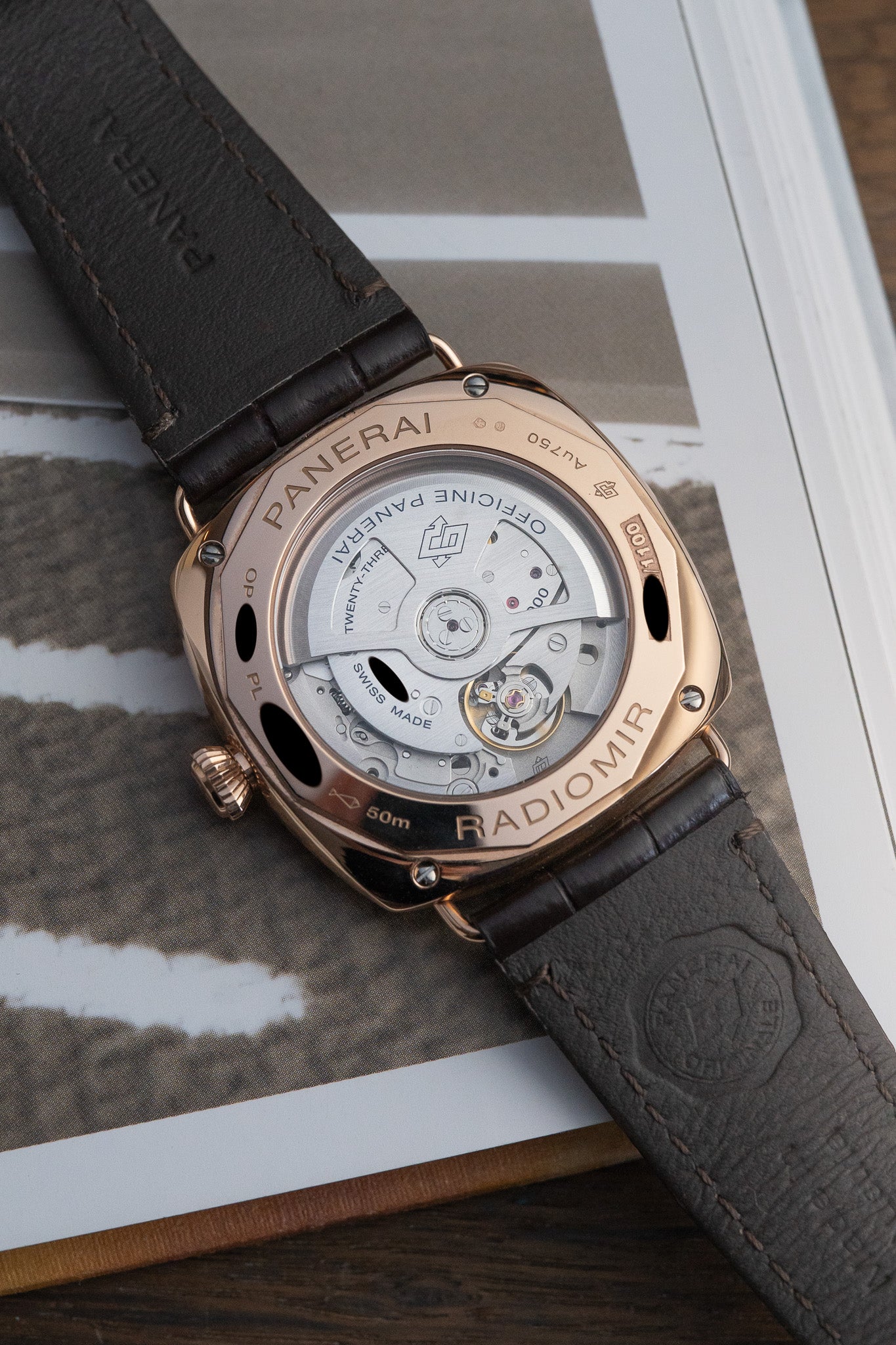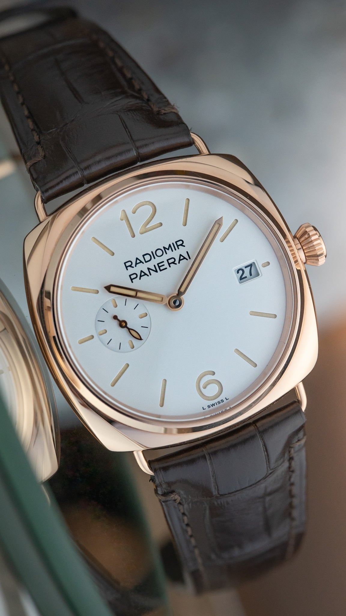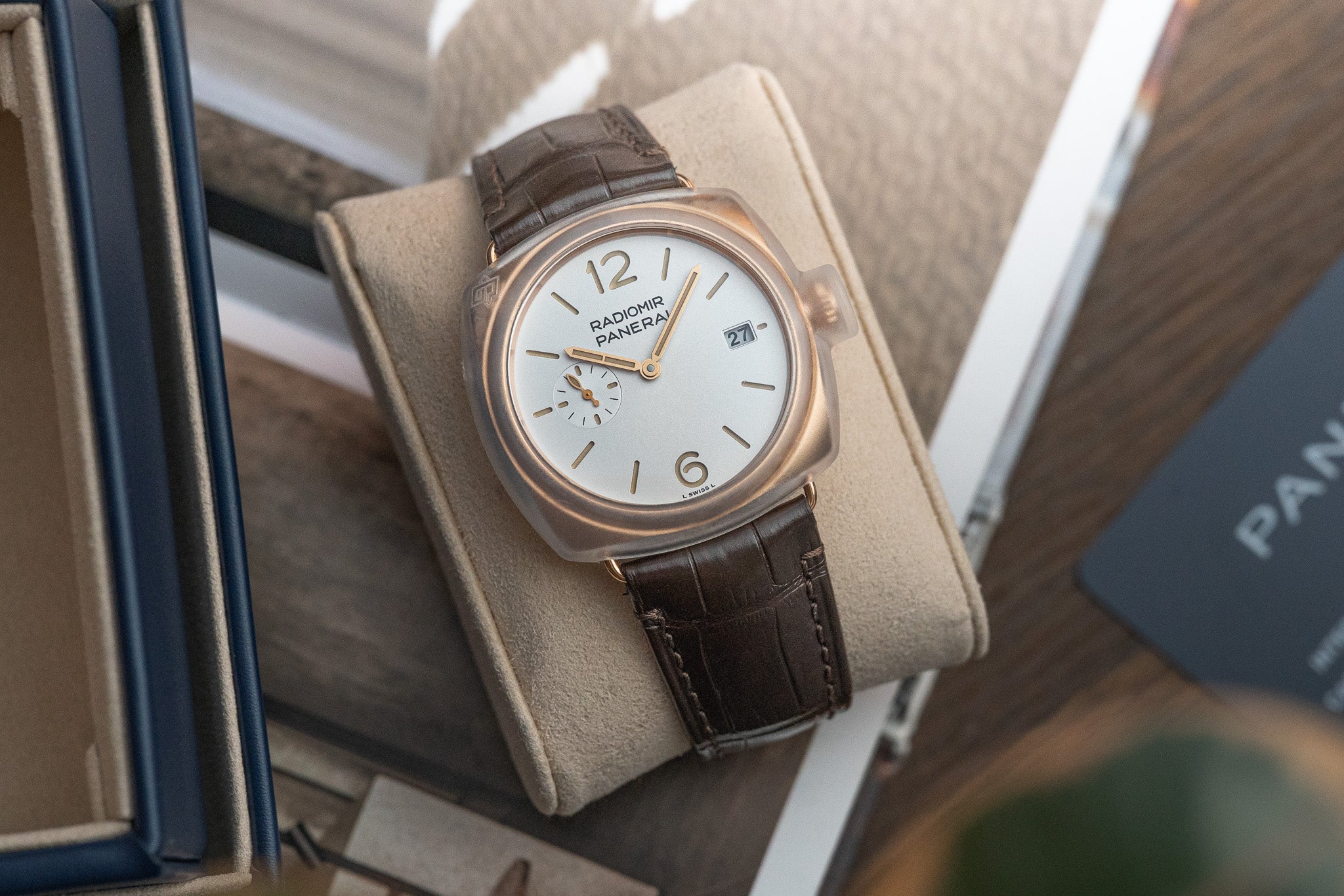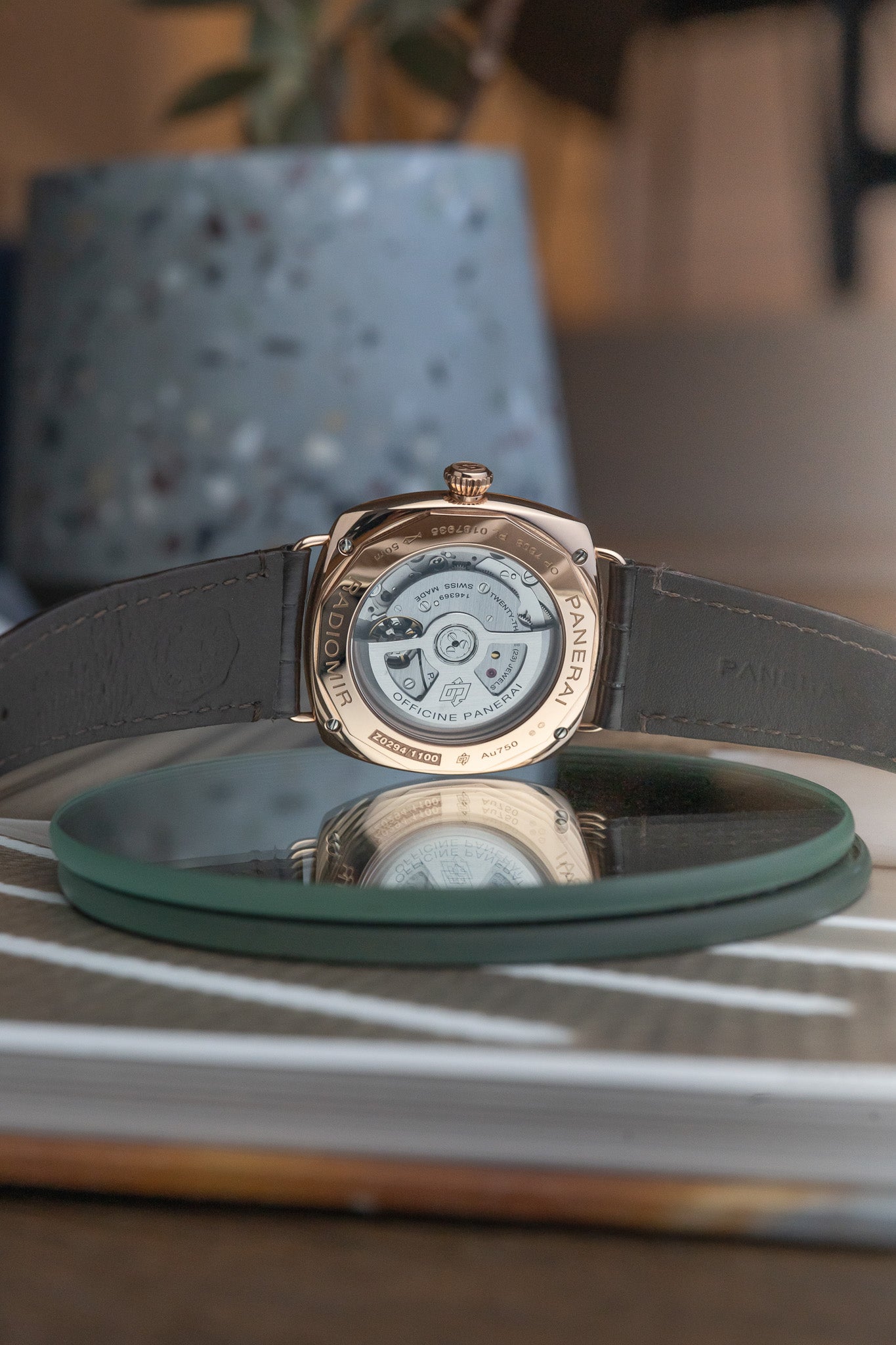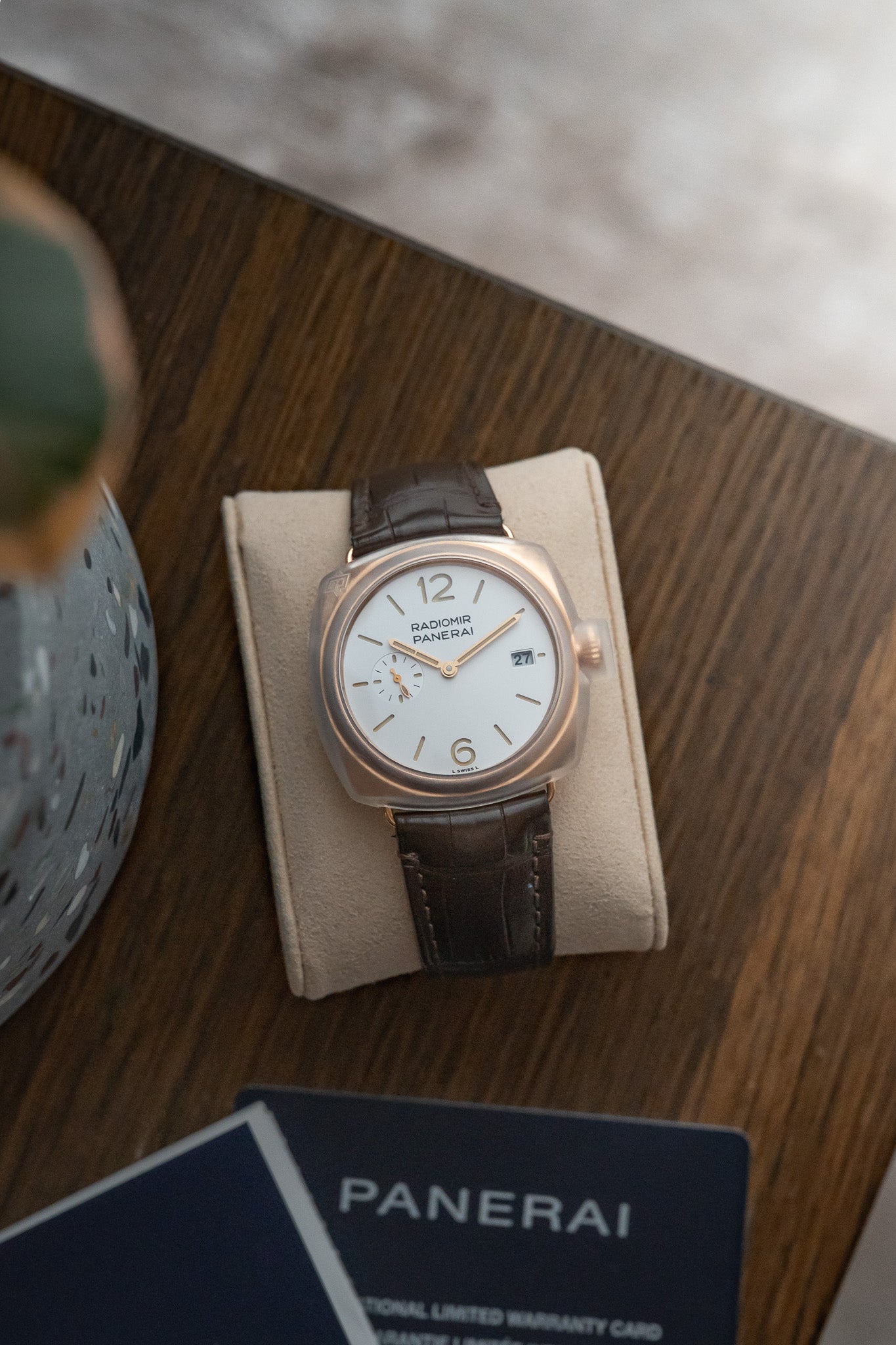 Crafted in Panerai Goldtech™ (a deep red gold alloy of copper and platinum), the PAM01026 features a polished cushion case, silver sun-brushed sandwich dial, and the ultra-reliable P.900 automatic movement with a 72-hour power reserve.