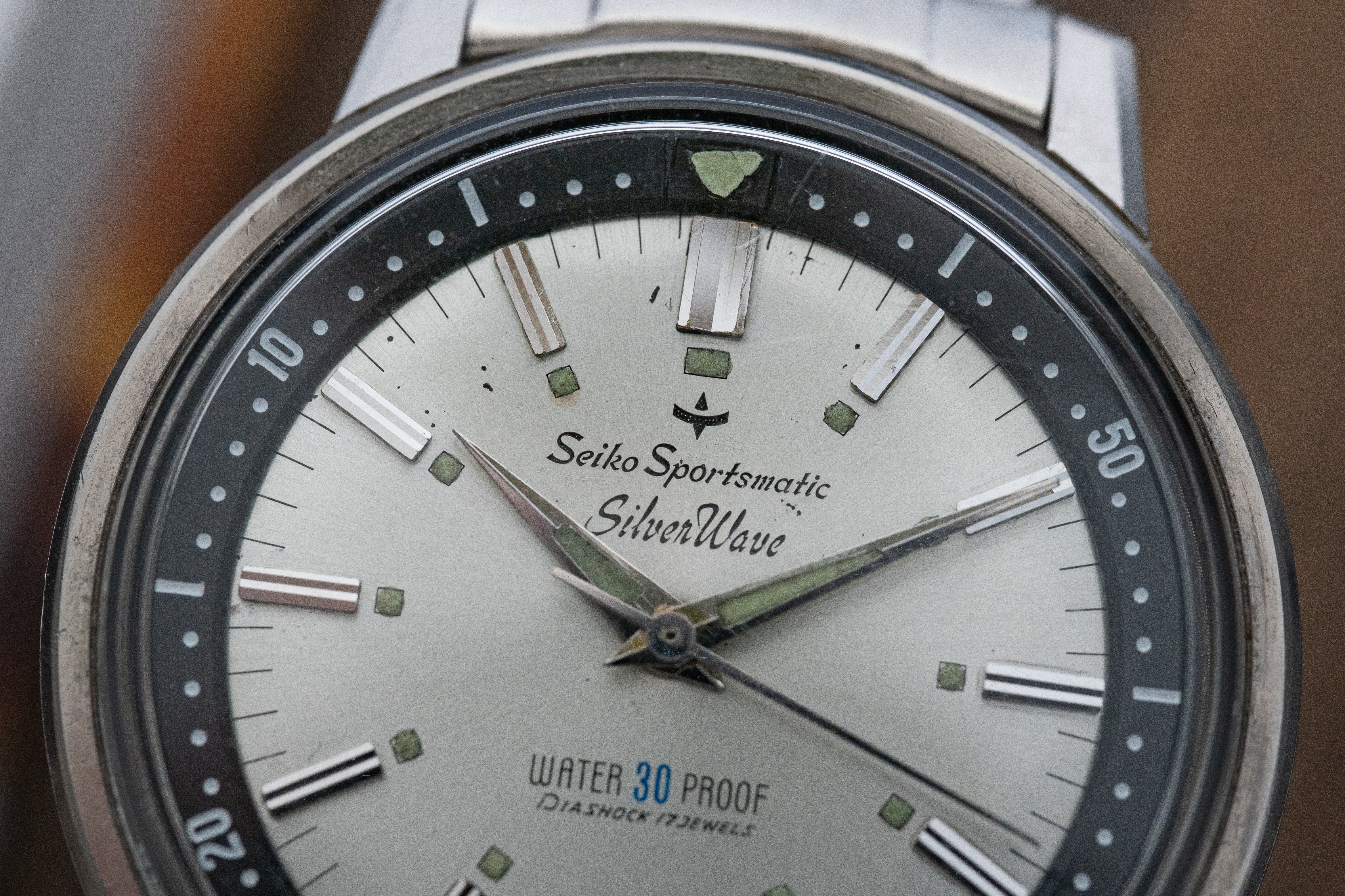 Hands & Lume: Original greenish lume present on hands and dial, including lume-filled triangle at 12 on the inner bezel. Attractive, natural aging.